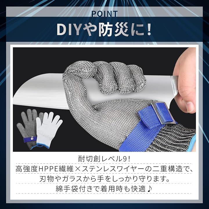 耐切創レベル9。高強度HPPE繊維xステンレスワイヤーの二重構造で、刃物やガラスから手をしっかり守ります。