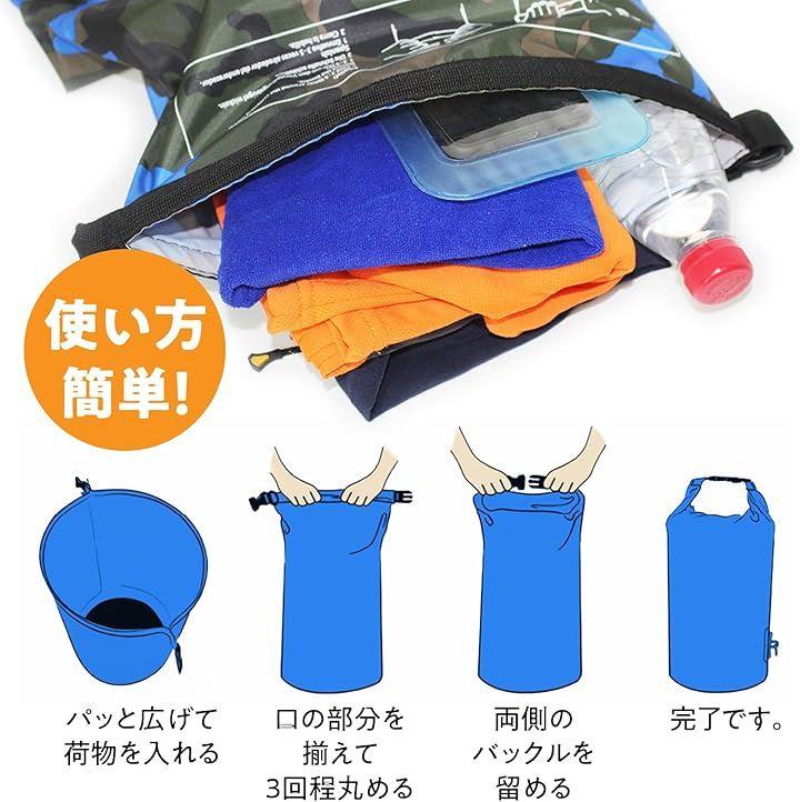 口を数回巻いてバックルで留めるだけでしっかり密閉でき、雨や波しぶき、砂埃などからスマホや衣類、貴重品をしっかり守ります。