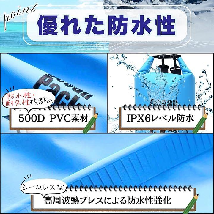 「防水性能」500デニールの厚手のPVC素材を採用し、IPX6規格の高性能防水を実現。