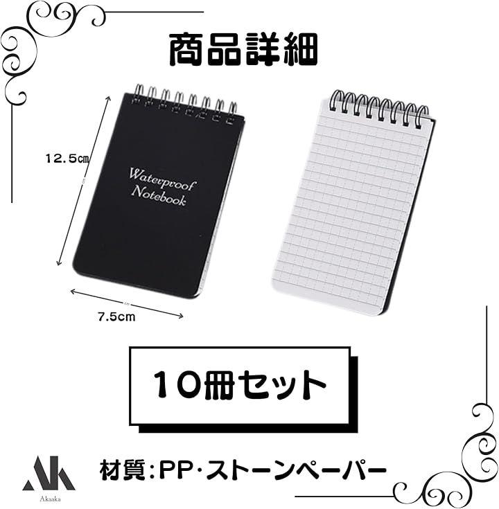 「商品スペック」サイズ:7.5x12.5cm、素材:PP(表紙)・防水紙(本文)、ページ数:50枚、セット数:10冊