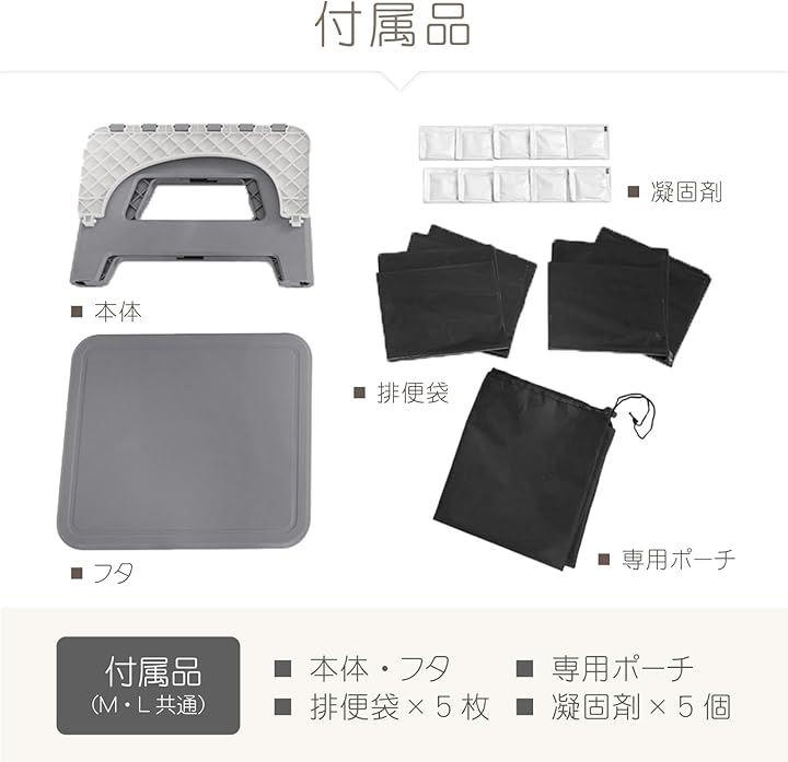 「セット内容/サイズ」折りたたみ簡易トイレ本体、蓋、排便袋x5枚、凝固剤x5枚、収納袋 Sサイズ:(組み立て時)高さ16x幅24x奥行30.5cm(折り畳み時)高さ6x幅24x奥行30.5cm Mサイズ:(組み立て時)高さ26x幅31.5x奥行36cm (折り畳み時)高さ6.8x幅31.5x奥行36cm