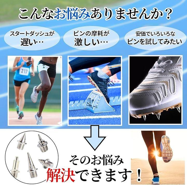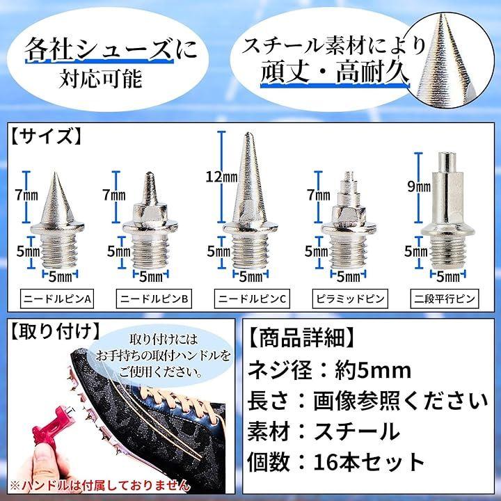 ニードルピンA(7mm):短~中距離 ニードルピンB(7mm):短~中距離 ニードルピンC(12mm):短距離 ピラミッドピン(7mm):短~中距離 二段平行ピン(9mm):走り幅跳び・三段跳び・棒高跳び