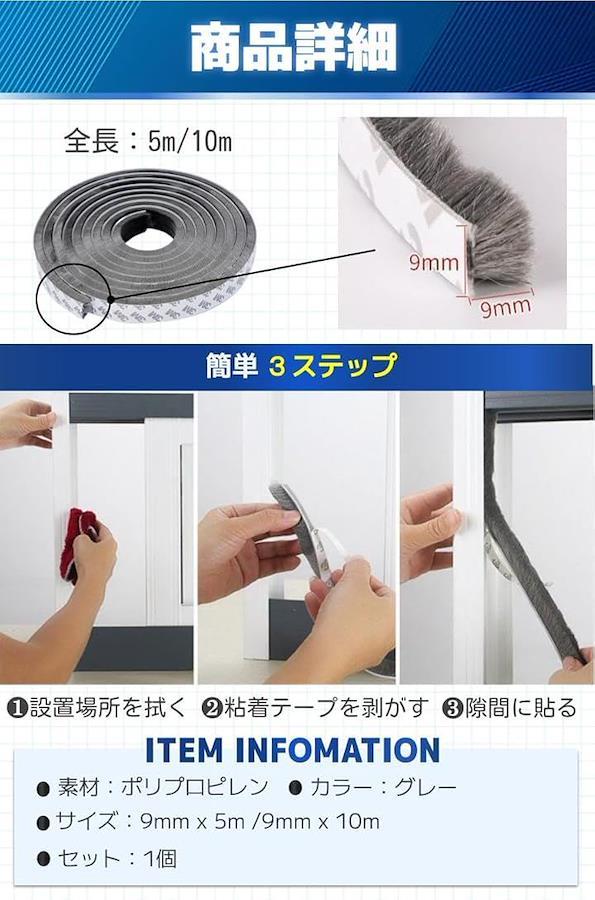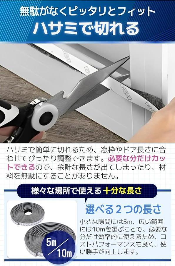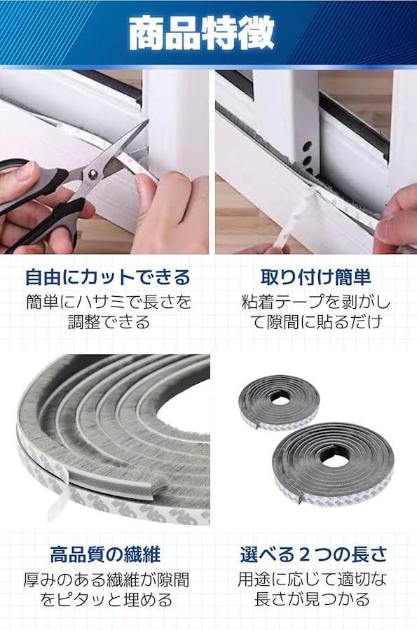 「商品特徴」(1)自由にカットできる:簡単にハサミで長さを調整できる/(2)取り付け簡単:粘着テープを剥がして隙間に貼るだけ/(3)高品質の繊維:厚みのある繊維が隙間をピタッと埋める/(4)選べる2つの長さ:用途に応じて適切な長さが見つかる