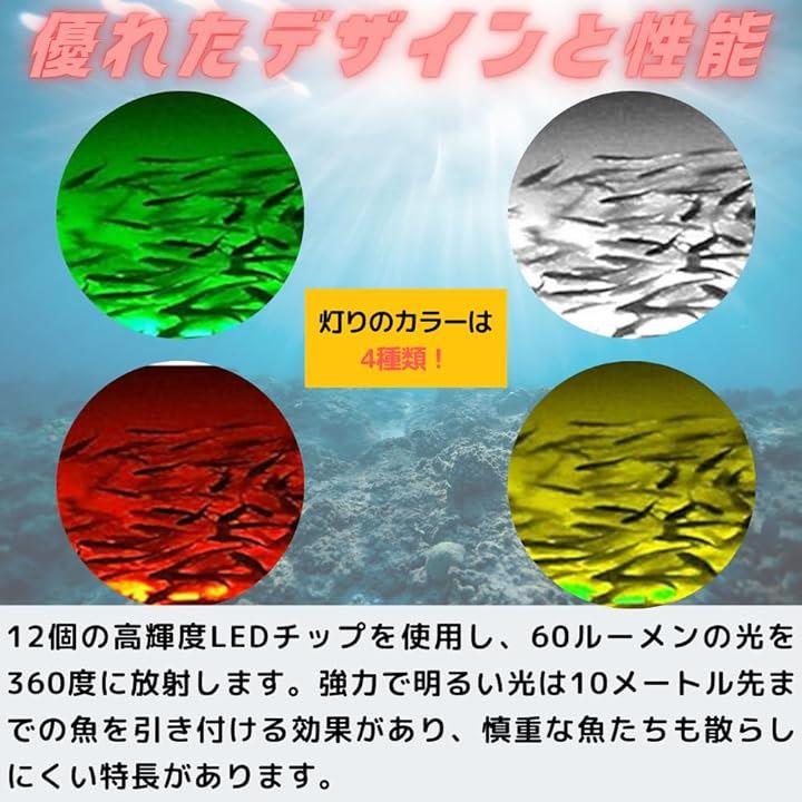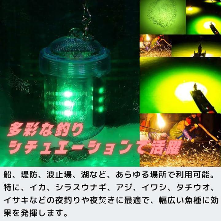 強力で明るい光は10メートル先までの魚を引き付ける効果があり、また緑色の光は魚を引き寄せる効果が高く、慎重な魚たちも散らしにくい特長があります。