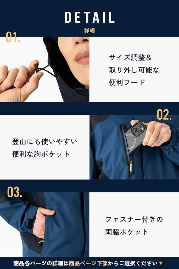 「利用シーン」登山、釣り、バイク、アウトドア、キャンプ、サイクリング、スポーツ、防災など 「機能」*ジャケット:撥水加工(耐水圧15,000mm)、防風、防寒 「カラー」ネイビー、ブラック、ブラウン、グリーン、レッド 「重量」ジャケット約520g 「メイン素材」ポリエステル 「サイズ」M~3XL 着丈 /肩幅/胸囲 /袖丈 [M] : 72 / 48 / 116 / 62 [L] : 74 / 50 / 120 / 64 [XL] :76 / 51.5 / 124 / 66 [2XL] :78 / 53 / 128 / 68 [3XL] :80 / 54.5 / 132 / 70