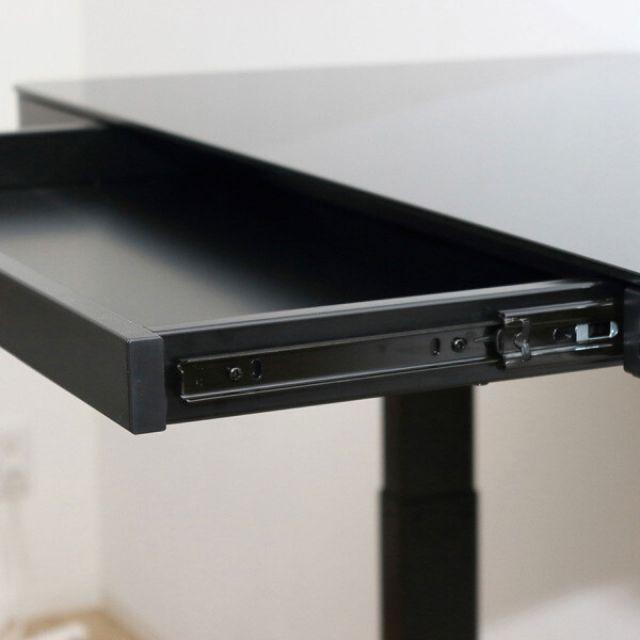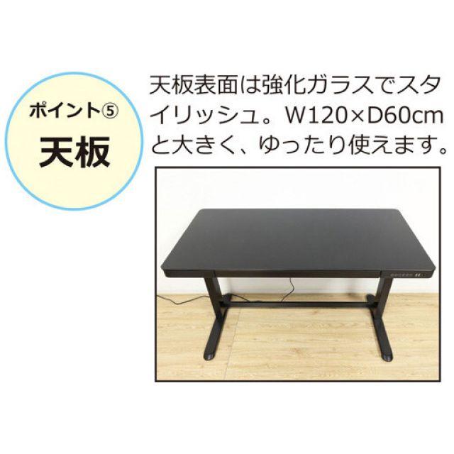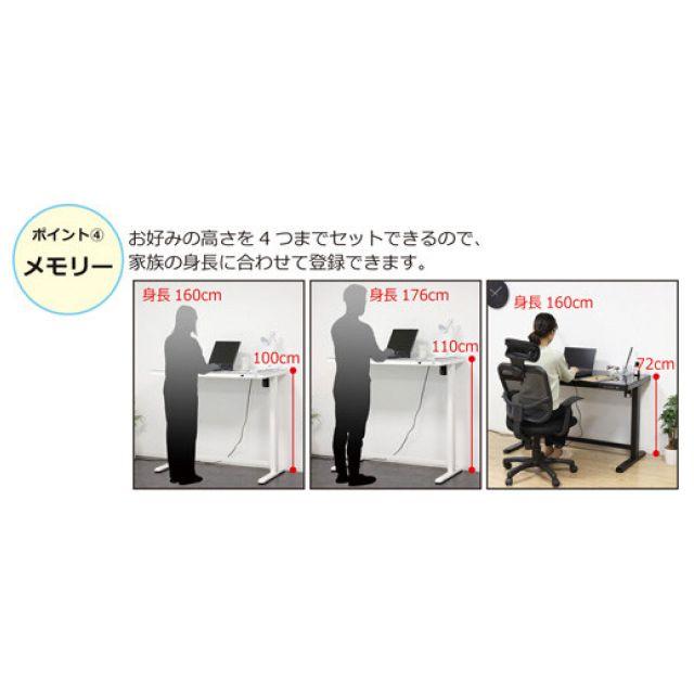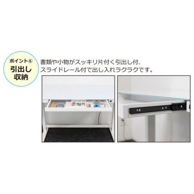 ●高さ調整:ボタン1つで高さ72〜121cmに微調整が可能。●力の要らない電動式が快適!●メモリー機能:お好みの高さを4つまで登録できます。●天板表面は強化ガラスでスタイリッシュ。幅120x奥行き60cmのゆったりタイプ。●引出し付きで小物や書類もスッキリ!●脚裏にはガタつき防止のアジャスター付です。