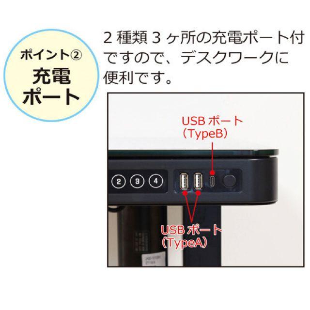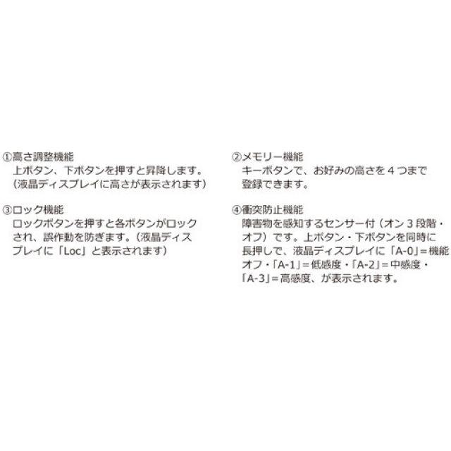 ●各ボタンを押すだけの簡単操作です。●ロック機能:各ボタンをロック!誤作動を防ぎます。●衝突防止機能:障害物を感知するセンサー付。●USBポート:TypeA、TypeCのUSB充電ポート付。●デスクワークに便利です。