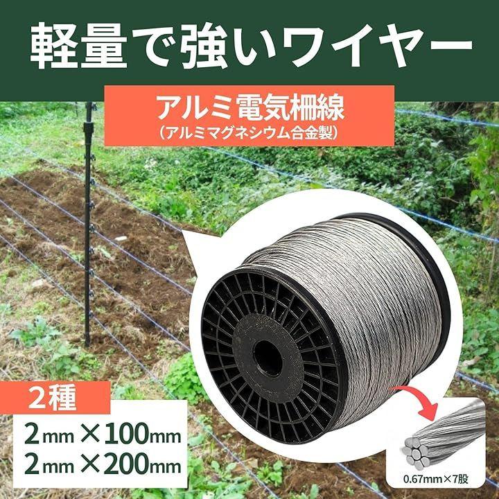 「商品仕様」材質:アルミニウム合金 線径:2.0mm(0.67mm 7股)長さの種類:100m / 200m 構造:撚線タイプ 特徴:高導電・軽量 適用:畑、果樹園、家庭菜園、山林の電気柵用ワイヤーに