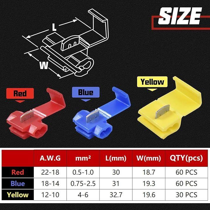 パッケージ内容: 合計 150 個のクイック スプライス ワイヤ コネクタ: 赤 60 個、青 60 個、黄色 30 個。
