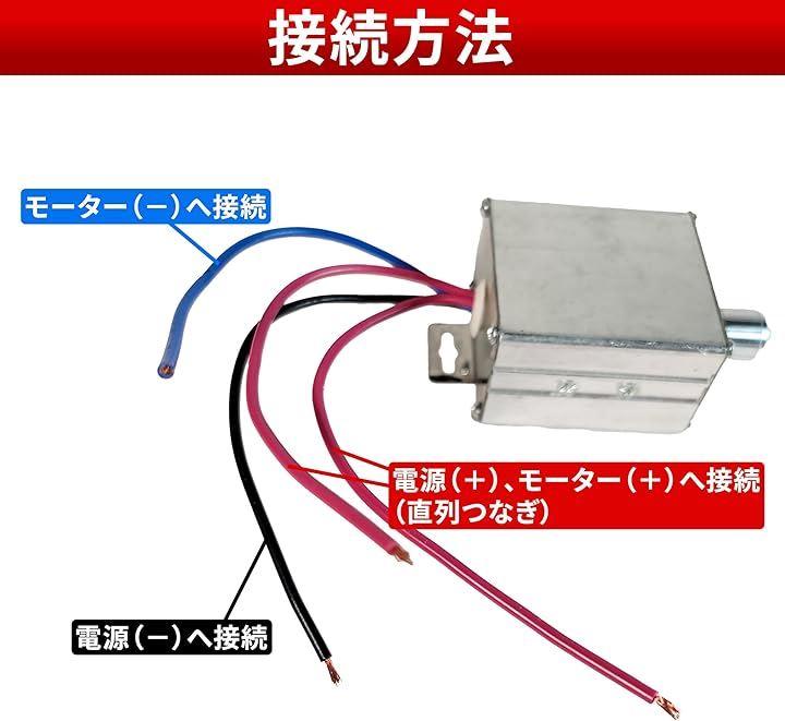 商品仕様 : ・入力電圧:DC12V~24V(機器により異なります) ・出力方式:無段階電圧調整 ・配線:赤=モーター・電源の正極/黒=電源の負極/青=モーターの負極 ・対応機器:DCモーター、電球、ヒーター、デフロスターなど