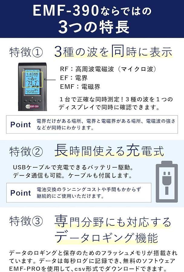 v「電磁波・電界・電磁界の3種を同時に表示」EMF-390は、高周波電磁波(マイクロ波)・電界(電場)・電磁界(磁場)の3種類の波を、1台で同時に測定できる電磁波測定器です。