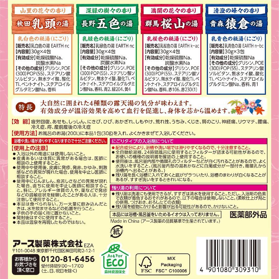 〇商品説明●大自然に囲まれた4種類の露天湯の気分が味わえます。●有効成分が温浴効果を高めて血行を促進し、身体を芯から温めます。●おうちでポカポカ温泉気分●薬用入浴剤●秋田乳頭の湯香り山里の花々の香りお湯色乳白色の秘湯(にごり)販売名乳白色の湯 EARTH nc●長野五色の湯香り深緑の樹々の香りお湯色乳緑色の秘湯(にごり)販売名乳緑色の湯 EARTH nc●群馬桜山の湯香り満開の花々の香りお湯色乳桜色の秘湯(にごり)販売名乳桜色の湯 EARTH k-ac●青森猿倉の湯香り清澄の峰々の香りお湯色乳青色の秘湯(にごり)販売名乳青色の湯 EARTH n-bc※本品は温泉を再現したものではありません。・Act For ECO・森林資源保全医薬部外品効能疲労回復、あせも、しっしん、にきび、ひび、あかぎれ、しもやけ、荒れ性、うちみ、くじき、肩のこり、神経痛、リウマチ、腰痛、冷え症、痔、産前産後の冷え症内容量秋田乳頭の湯30g×4包、長野五色の湯30g×4包、群馬桜山の湯30g×4包、青森猿倉の湯30g×3包