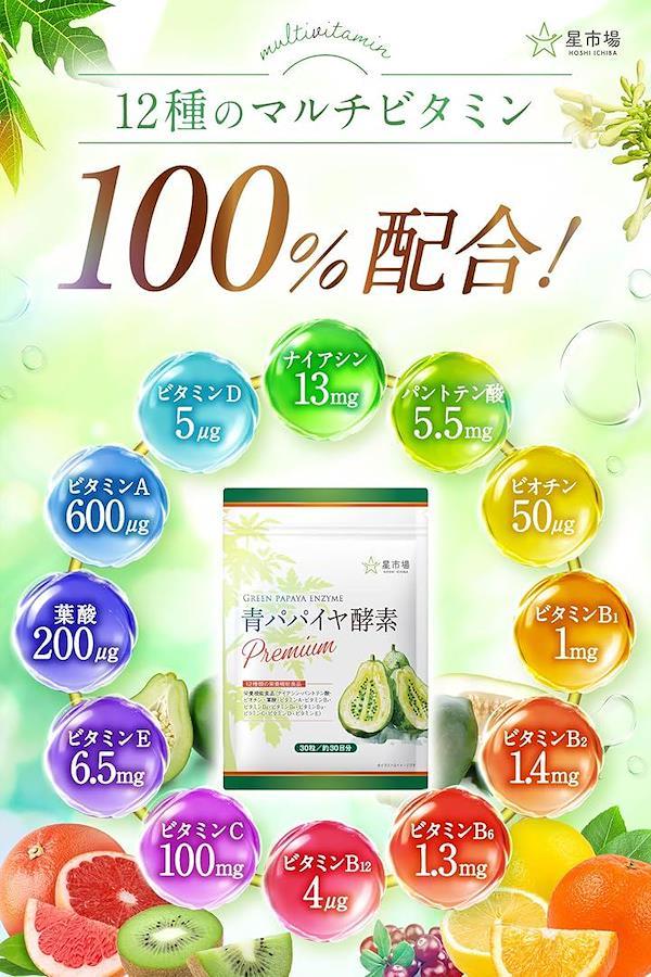 「12種類のマルチビタミンを配合」ナイアシン、パントテン酸、ビオチン、葉酸、ビタミンA、ビタミンB1、ビタミンB2、ビタミンB6、ビタミンB12、ビタミンC、ビタミンD、ビタミンEの12種類のマルチビタミンを配合しています。