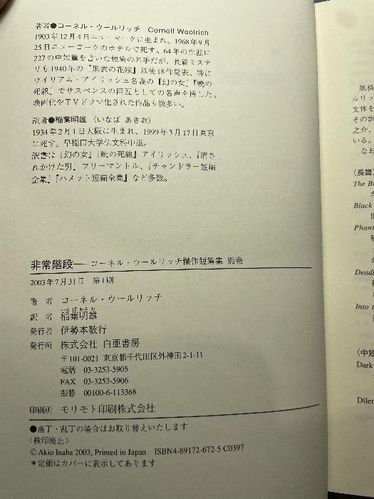 a04-251215002005015-000非常階段 (コーネル・ウールリッチ傑作短篇集 別巻) 白亜書房 コーネル ウールリッチ