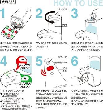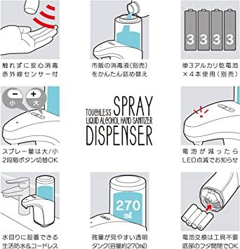 ●消毒用アルコール専用のディスペンサーです。●赤外線センサーで触れずに消毒ができます。●スプレー量は2段階切り替え式。●電池が減ったらLEDが点滅してお知らせします。