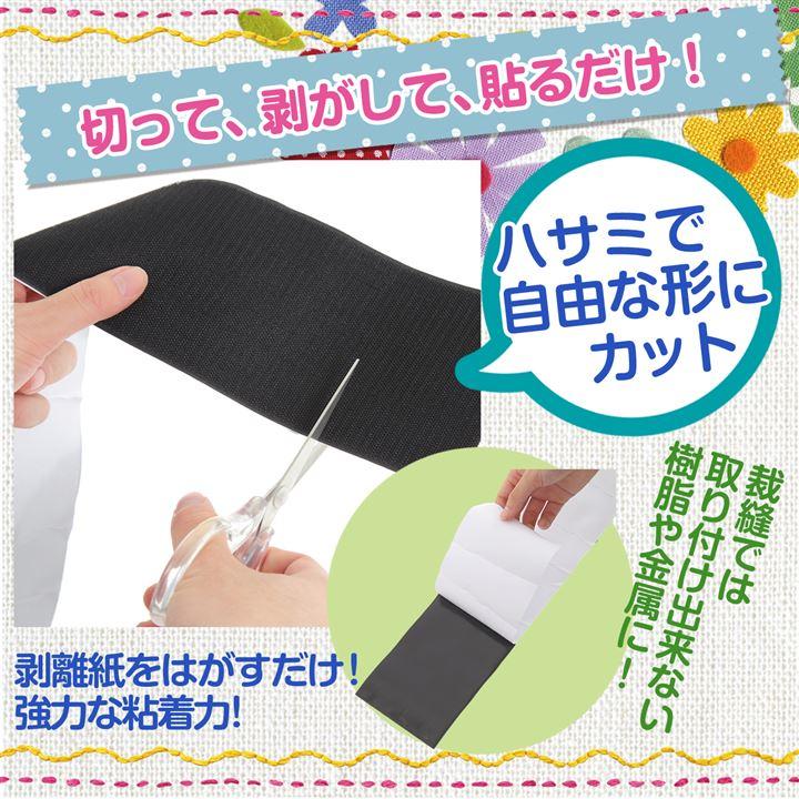 糊付き粘着タイプの面ファスナーなので、縫製タイプでは縫い付けできない金属、プラスチック、ガラス、タイルなどにも簡単接着。