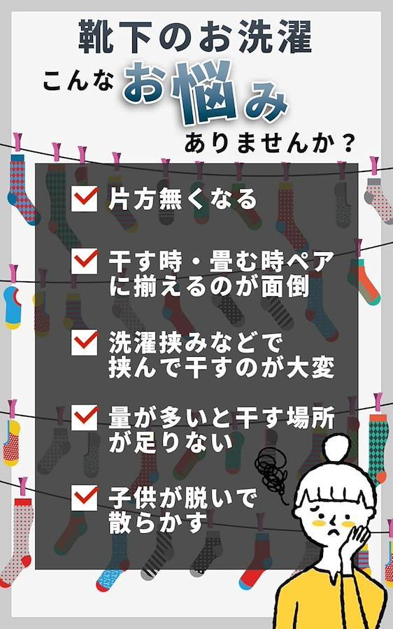 「靴下のお洗濯 こんなお悩みありませんか?」*片方無くなる*干す時・畳む時ペアに揃えるのが面倒*洗濯挟みなどで挟んで干すのが大変*量が多いと干す場所が足りない*子供が脱いで散らかす