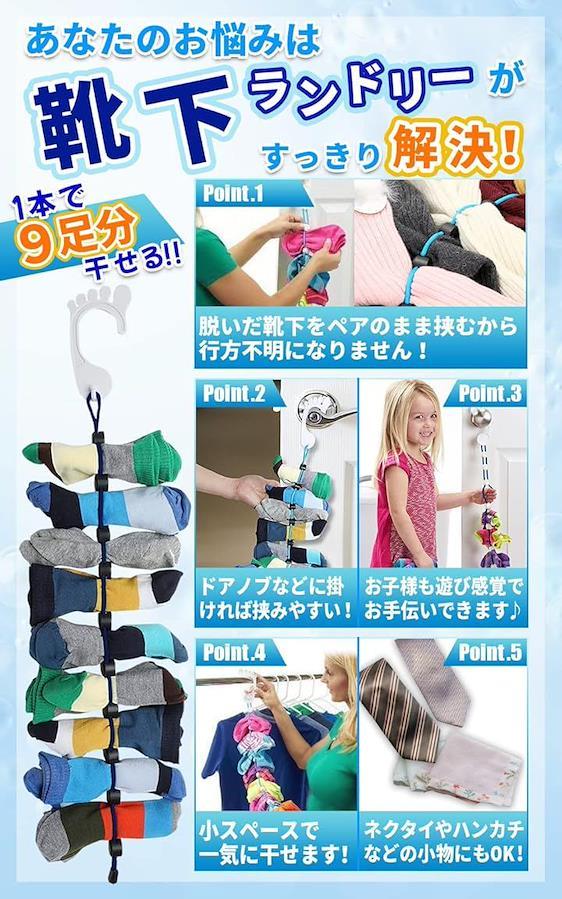 「あなたのお悩みは靴下ランドリーがすっきり解決。」1本で9足分が一気に干せる。脱いだ靴下をペアのまま挟むから行方不明になりません。ドアノブなど、お子様でも手の届く場所にかけられます。挟んだままお洗濯してそのまま干すだけでOK。お子様も遊び感覚でお手伝いできます。小スペースで一気に干せます。下着やハンカチなどの小物にもご使用いただけます。小スペースで干せるので、キャンプや災害時などにもお役立ていただけます。