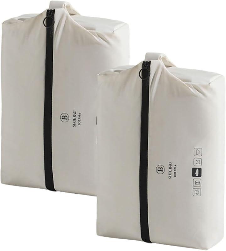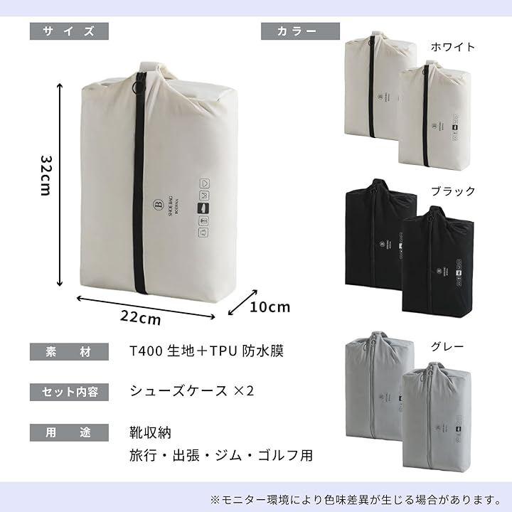 「仕様」 サイズ:約32x22x10cm 素材:T400生地+TPU防水膜 カラー:ホワイト/ブラック/グレー セット内容:シューズケースx2 用途:靴収納、旅行・出張・ジム・ゴルフ用 *モニター環境により、実際の色味と異なって見える場合があります。