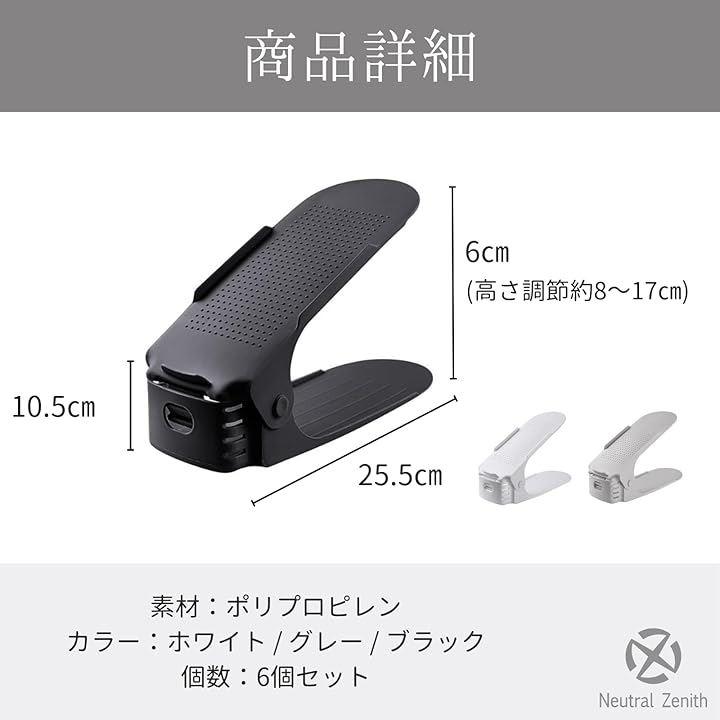 「商品詳細」シューズホルダーx6個セット サイズ:25.5x10.5x6cm(高さ調節約8~17cm) 素材:ポリプロピレン カラー:ホワイト / グレー / ブラック
