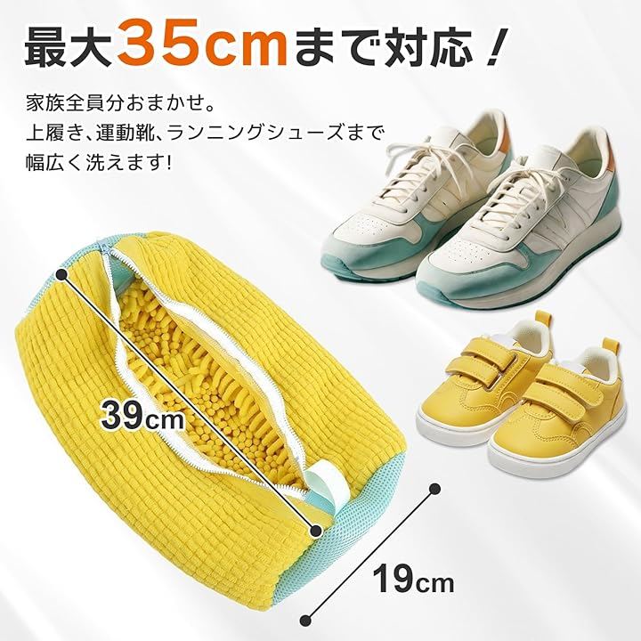 直径19cmx縦39cmのサイズで大人用シューズにも対応し、靴洗いネットとして毎日の洗濯をサポートします。