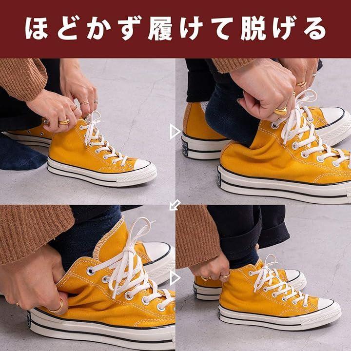 「脱ぎ履きが驚くほどスムーズに」 ゴムの伸縮性を活かした靴紐で、毎回ほどかなくてもスムーズに脱ぎ履き可能。