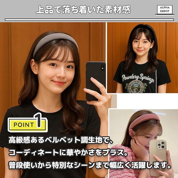 「製品仕様」幅:約3cm/厚み:約3cm/材質:ベルベット調布料/形状:幅広カチューシャ/カラー:黒・ピンク・グレー/用途:日常・フォーマル・アクセント