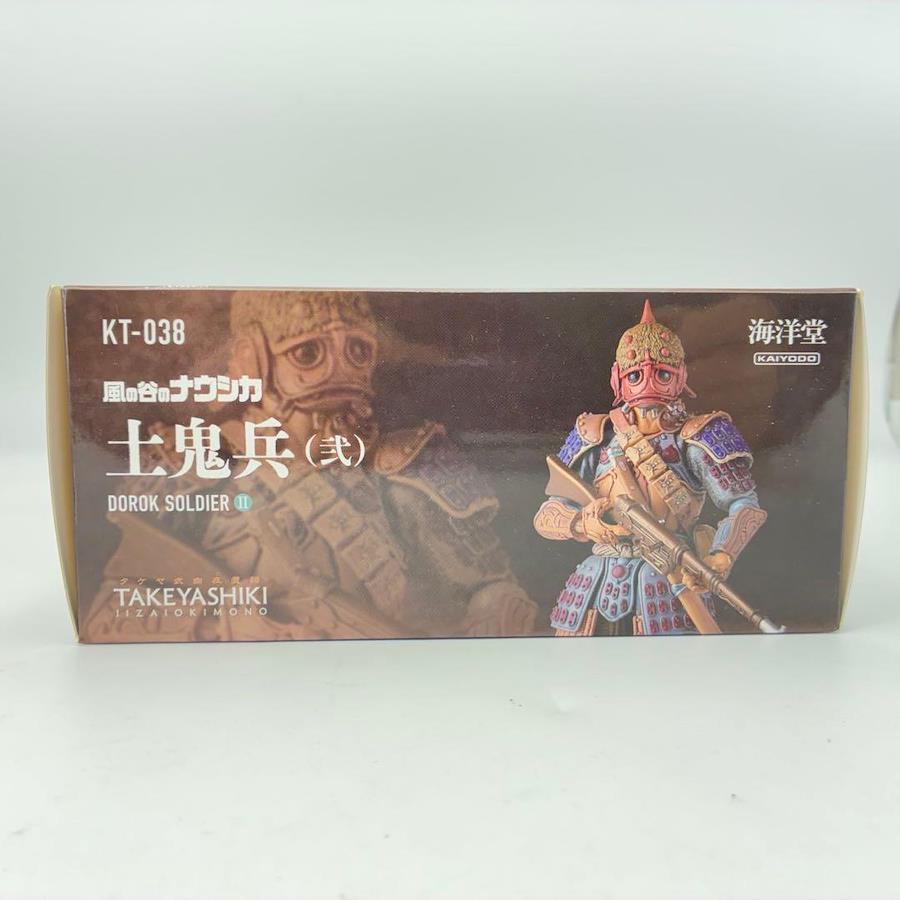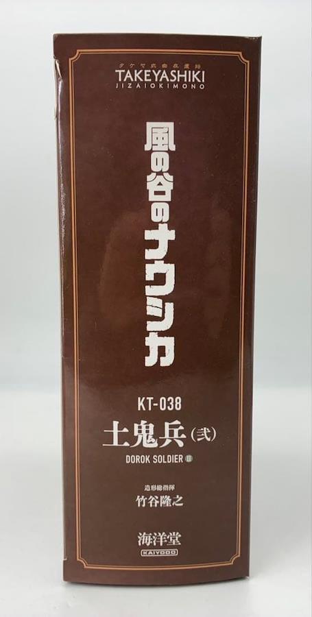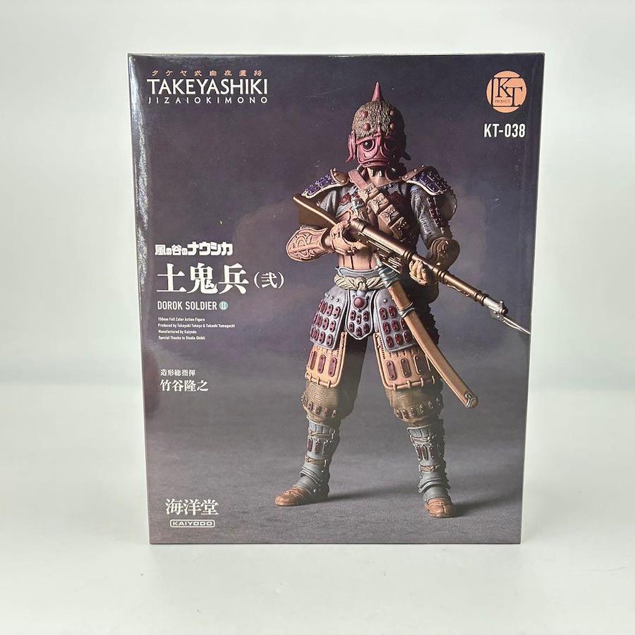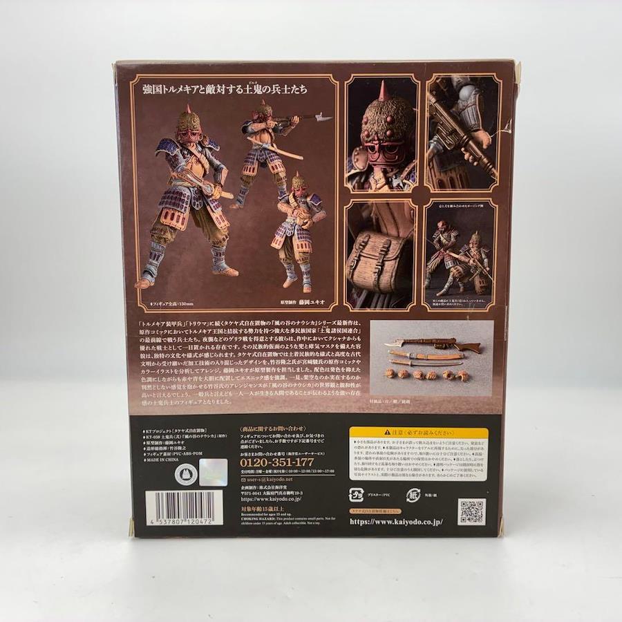 タケヤ式自在置物では土着民族的な様式と高度な古代文明から受け継いだ加工技術の入り混じったデザインを、竹谷隆之氏が宮崎駿氏の原作コミックやカラーイラストを分析してアレンジ。藤岡ユキオが原型製作を担当した。配色は発色を抑えた色調にしながらも赤や青を大胆に配置してエスニック感を強調。一見、架空なのか実在するのか判然としない感覚を抱かせる竹谷氏のアレンジセンスが『風の谷のナウシカ』の世界観と親和性が高いと言えるでしょう。一般兵と言えども1人1人が生きる人間であることが伝わるような強い存在感の土鬼兵士のフィギュアとなりました。