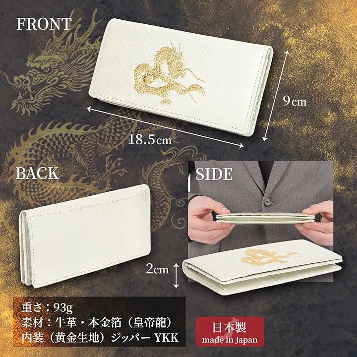 「財布の特徴」皇帝龍の力: 強力な金財運を引き寄せる紋章を本金箔刻印 高品質な素材:厳選された上質な牛革を使用 ( 本革 財布 )信頼の日本製:熟練革職人による総ハンドメイド品 熟慮の収納設計:カードやお金もスリムに収納で金運好転 高貴なカラー:金色の中でも高貴なシャンパンゴールド特注革で謹製した新作の 金運財布 。