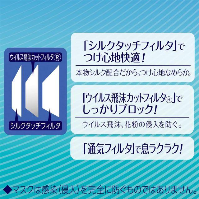 やわらかストレッチ耳かけで、ず~っと、耳らくらく!長時間でも耳が痛くならない。更に、本物シルク配合で、つけ心地なめらか!ウイルス飛沫カットフィルタ®で、空気中のウイルス飛沫・花粉の侵入をしっかりブロックします。PM2.5にも安心。
