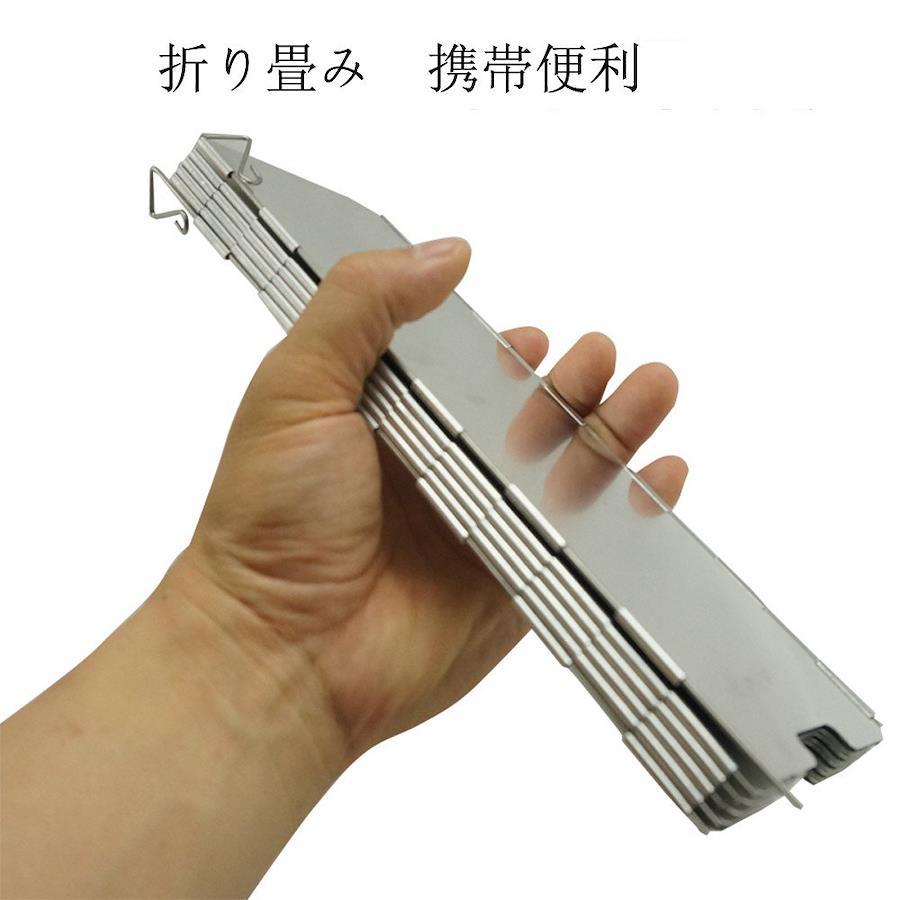?延長版の風除板です。サイズ:各プレートの外形寸法:約8.2×24センチメートル 展開(10プレート)の寸法: 約82×24センチメートル 収納時:24cmx8cmx2cm 重量:280g?素材:アルミニウム、ステンレス。アルミニウム合金材料で、軽量、耐摩耗性と耐久性に優れています。または折りたためる小型・軽量で登山用品/キャンプ用品として便利なサイズです。?キャンプ、登山、ハイキングなどのアウトドアシーンで活躍!風のある日や寒い日にあると便利です。地面にウインドシールドを固定するペグに建てられます。または効率向上のために、燃料を節約することができます。カセットガスコンロ、アウトドアコンロ、クッカーの風よけにおすすめです。?家ではホットプレートで焼き肉、たこ焼きをするときに、油が周囲に飛ばないように、ホットプレートの半周を囲むようにして使用しています。後片付けが楽になっていいです。キャンプでも家でも活躍しております。?小型・軽量の抜群の持ち運びやすさ!収納ハードケース付きでキャンプ、登山、ハイキングはもちろん室内利用も可能。