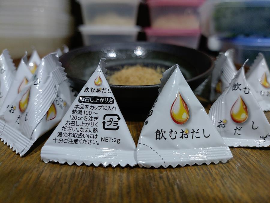 さっと溶ける顆粒タイプのお出汁です。1個ずつ個包装になっているので、とっても便利!お湯さえあれば美味しいお出汁を簡単に飲めるので、朝食や職場のお昼ご飯のお供に、また天然のアミノ酸飲料でもあるお出汁は健康維持にもオススメです。ぜひお試しください!