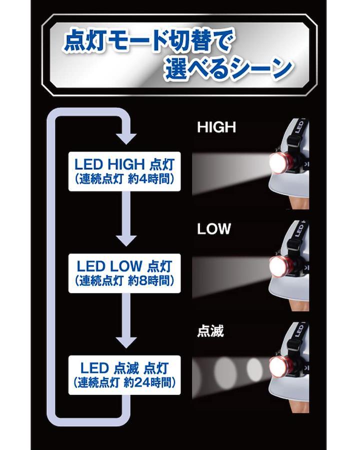 大光量で強力に照らすズレにくい滑り止め付バンドライト部/電池ボックスセパレートタイプズーム式フォーカスコントロール機能搭載点灯モード切替で選べるシーンアウトドアや夜間作業時に電源:単3形乾電池×3本(市販品)、使用電球:白色LED(交換不可)全光束:約240lm(HIGH)/110lm(LOW)、正面1mの照度:約560lx(HIGH)/175lx(LOW)電池寿命:連続約4時間(HIGH)/約8時間(LOW)/約24時間(点滅)質量:約140g(電池含まず)、防水規格:IPX4(防沫型)