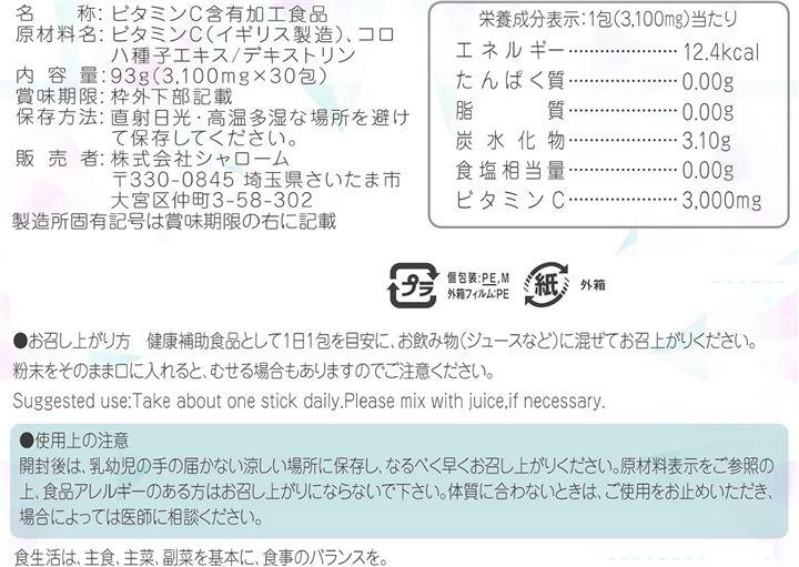 原材料:ビタミンC(イギリス製造)、コロ 八種子エキス/デキストリン