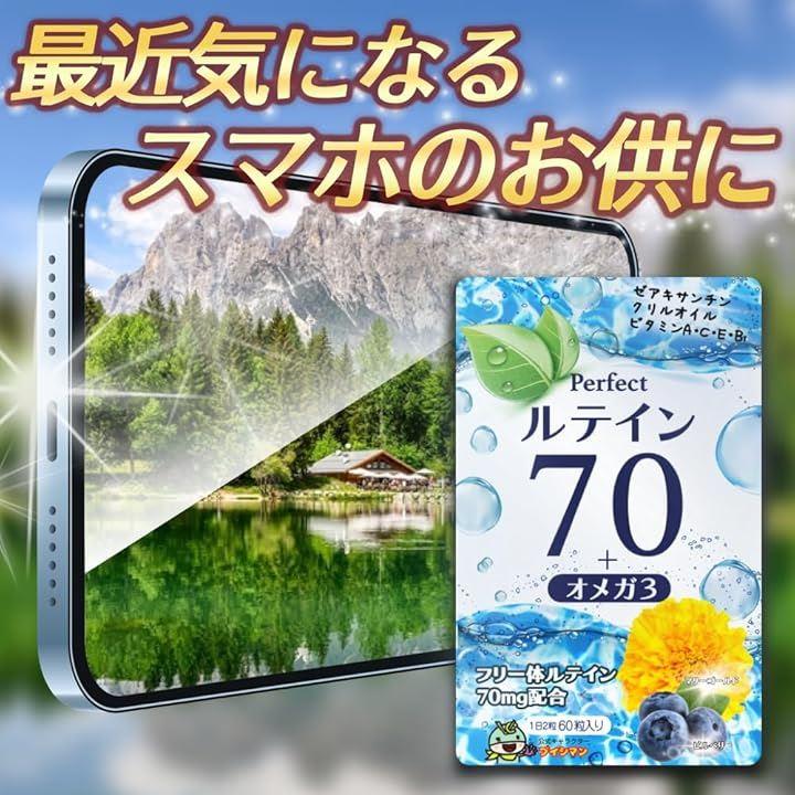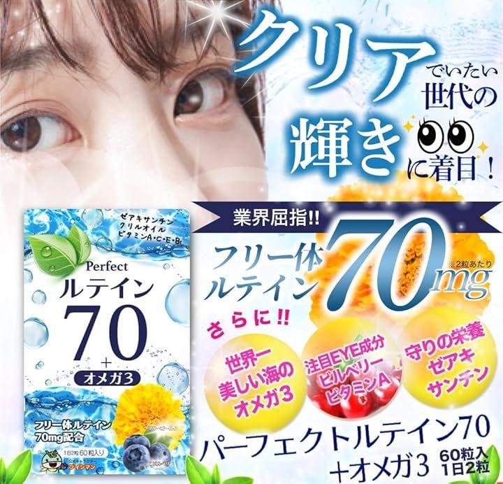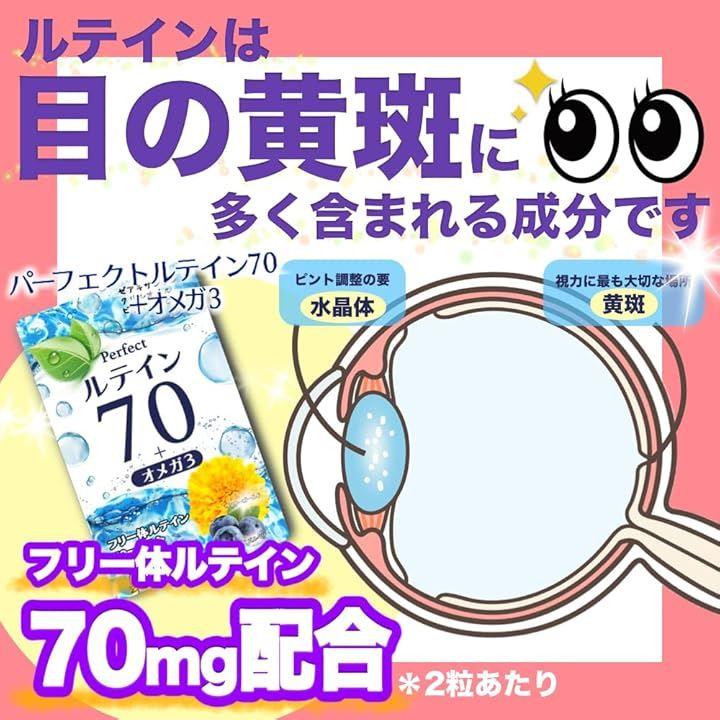 パーフェクトルテイン70+オメガ3は高濃度のフリー体ルテイン70mgを1日あたり2粒に配合したサプリメントです。