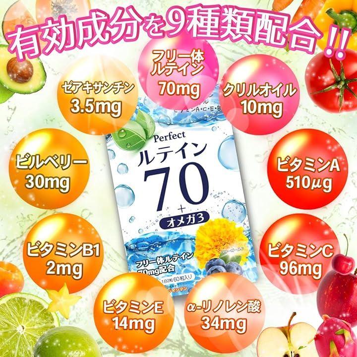 パーフェクトルテイン70+オメガ3はフリー体ルテイン70mgだけでなく1日あたり2粒にビルベリー抽出エキス30mg(アントシアニン10.8mg)とゼアキサンチン3.5mgもたっぷり配合したサプリメントです。