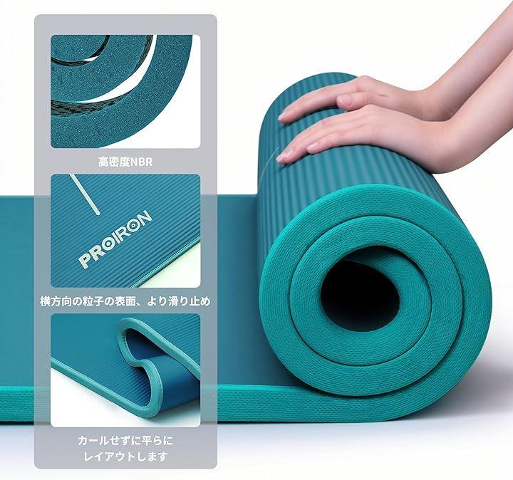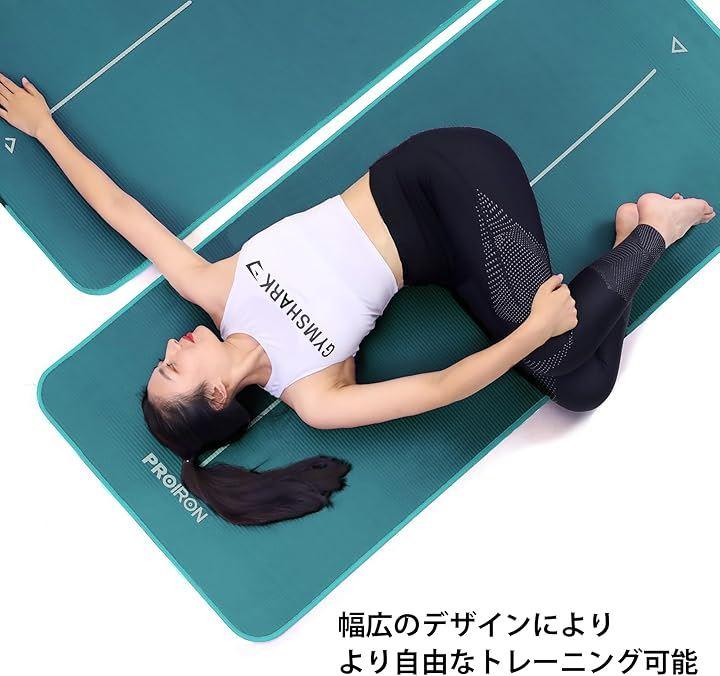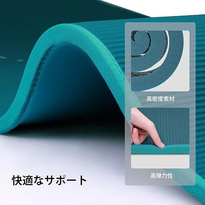 「進化版、10mmヨガマット」 183cm x 66cmx10mmの寸法で、自由なストレッチと多様なチャレンジングなヨガ・ピラティスポーズを実践するのに適した余裕を提供します。