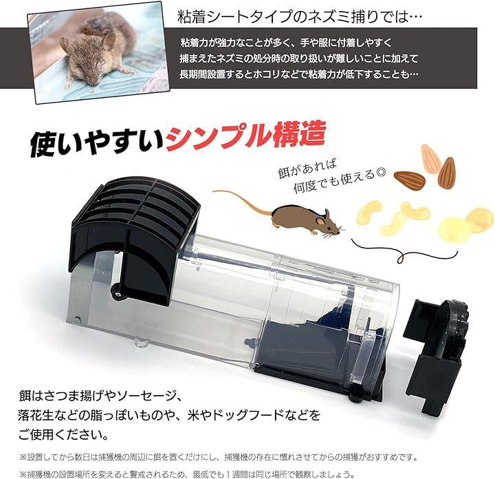 設置後すぐに使用するのではなく、数日間は捕獲機の周辺にエサを置き、ネズミが捕獲機の存在に慣れるようにするのが効果的です。