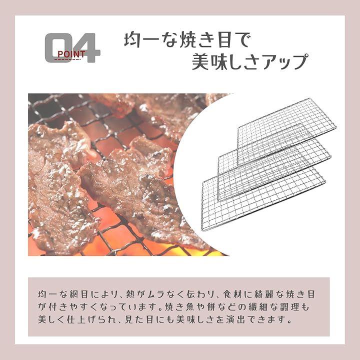 「均一な焼き目で美味しさアップ」均一な網目により、熱がムラなく伝わり、食材に綺麗な焼き目が付きやすくなっています。