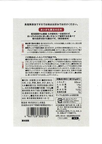 あいがも農法で育てた、宮城県産ひとめぼれを使用した、食塩無添加で素朴なおかゆです。国産の五穀(押麦、黒米、きび、あわ、もち米)、小豆を加え、食感も見た目もよく、原料と素材の旨みを活かして仕上げました。塩を加えていないため、お好みで塩を足してお召し上がりください。(160gあたり) エネルギー68kcal たん白質1.4g 脂質0g 炭水化物15.5g 食塩相当量0g