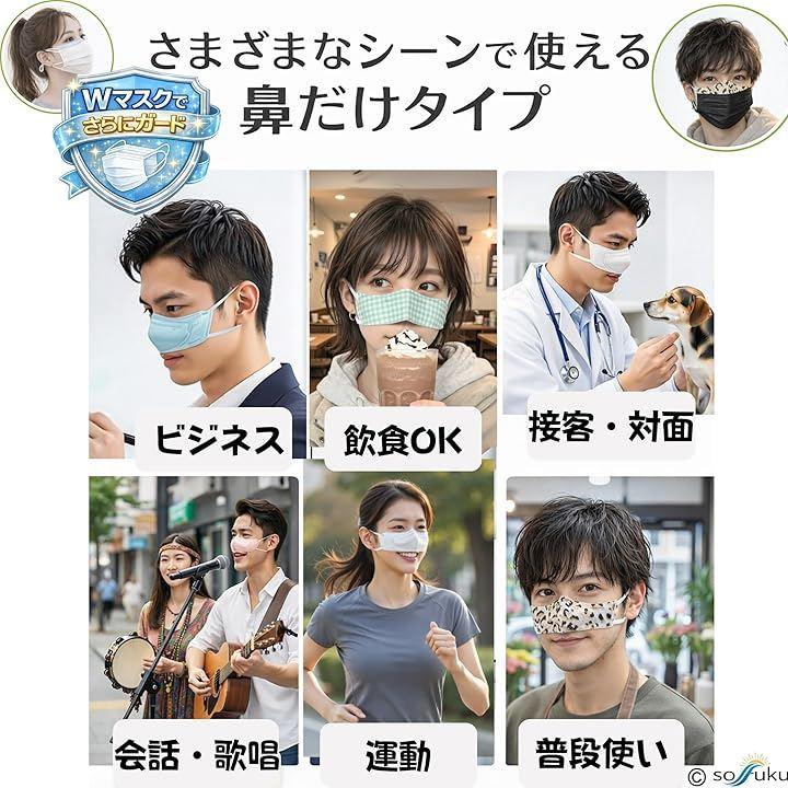 鼻周りのみを覆う設計のため、飲み物や会話の際にも邪魔になりにくい仕様です。