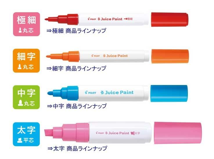 「ジュースペイント」のインキは特に水性顔料インキの中でも、乾きやすく、筆跡が擦れても消えにくいのが特長です。