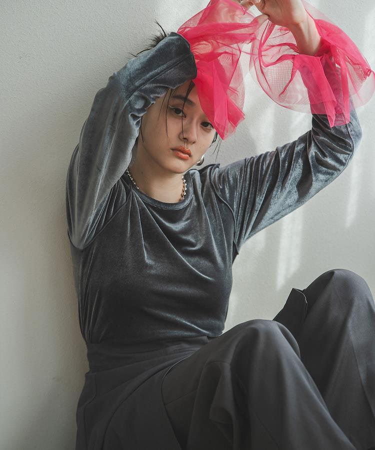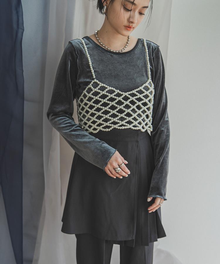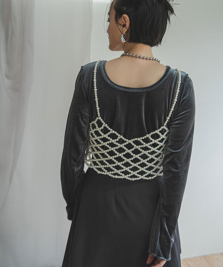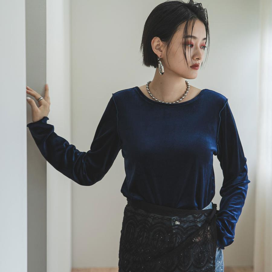 ネックの深さを前後2wayで楽しめるベロアトップス。