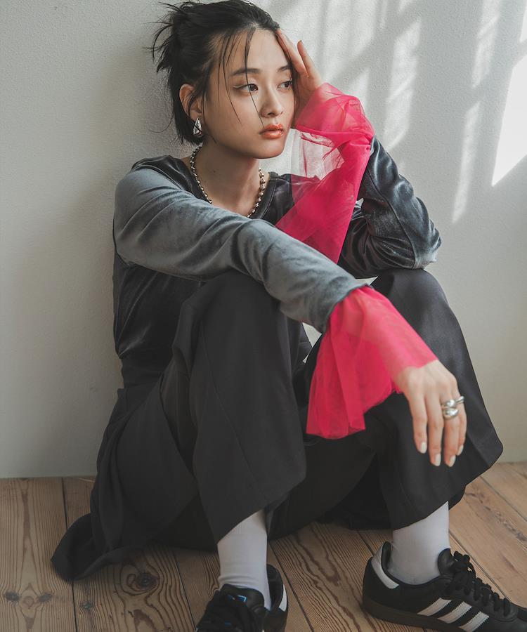 季節感を楽しめるベロア素材はシンプルなシルエットながらも、一気にこなれた雰囲気に。