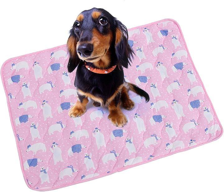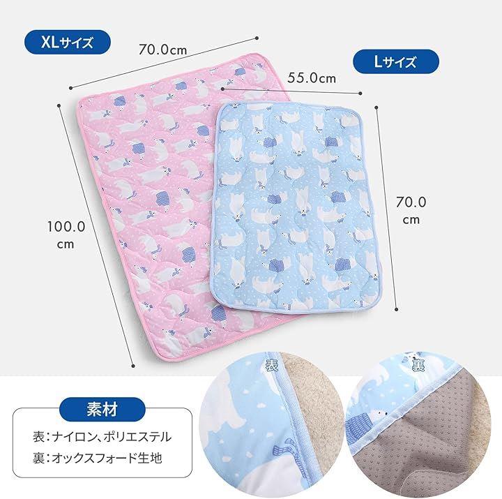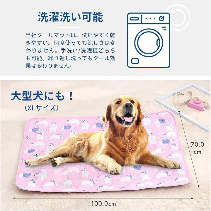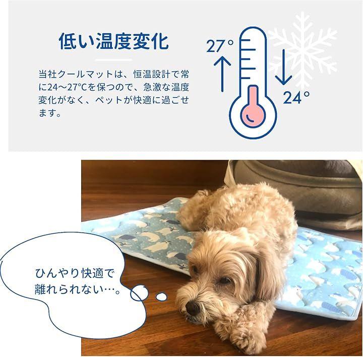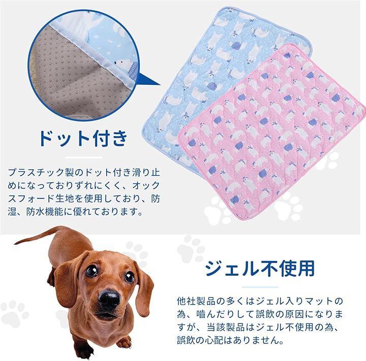 「ナイロン、ポリエステルの混紡技術による素材でひんやり感、ソフトで快適、肌にやさしく、優れた通気性により、熱の放熱が早くより涼しい」 「大小の通気孔のある繊維で空気が通り抜けるので、爽やか快適」 「プラスチック製のドット付き滑り止めになっておりずれにくく、オックスフォード生地を使用しており、防湿、防水機能に優れております」 「他社製品の多くはジェル入りのマットが多く使用されている為ペットが噛んだりして誤飲の原因になりますが、当該製品はジェル不使用の為、誤飲の心配はありません」 「クールマットは、恒温設計で常に24°~27°Cを保つので、急激な温度変化がなく、ペットが快適に過ごせます」 「PET BRILLIANTクールマットは洗濯洗い可能。
