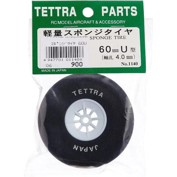テトラ 軽量スポンジタイヤ 60φU 軸径4.0mm 01140 軽量!ゴムタイヤの約1/2。軽量で好評の高級スポンジタイヤの普及型です。ホイールは丈夫なグラス入りナイロン樹脂製。タイヤは水を吸わない、単泡スポンジゴムを使用。精密スリック仕上げで、芯振れが少なくはずれにくい構造。タイヤ交換は自由、容易にできます。スポーツスタント機の引込脚に最適。種類はU型 (ノーマル)及びR型 (ラジアル)があります。