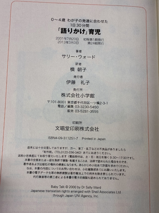 ■商品詳細■ 商品名・0~4歳 わが子の発達に合わせた1日30分間「語りかけ」育児 小学館 サリー ウォード/ ■商品状態■表紙にスレ、ヤケ、シミ、天地小口にスレ、ヤケ、多数のシミ、本にスレ、ヤケ、シミ、があります。本を読むことに支障はございません。※注意事項※■毎商品チェック後出品しておりますが、中古品ということもあり、多少の書き込み等のチェック漏れがあった際はご容赦下さい。■付録等の付属品がある商品の場合、記載されていない物は『付属なし』とご理解下さい。■併売販売をしているため、在庫切れの場合はキャンセルとなります。予めご了承ください。