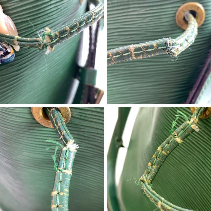 上部絞る部分のレザー紐が糸のみで繋がっていて