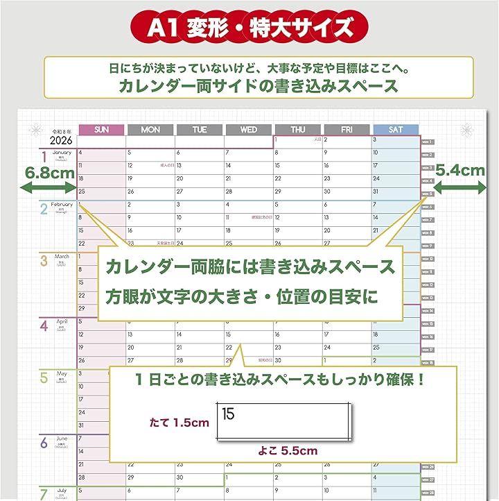 カレンダー両脇に書き込み自由なフリースペースを確保。