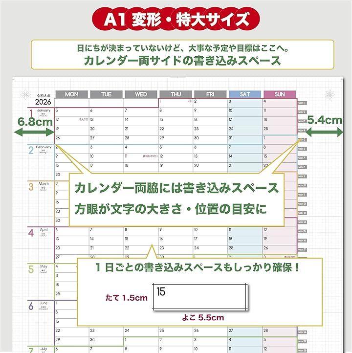 カレンダー両脇に書き込み自由なフリースペースを確保。